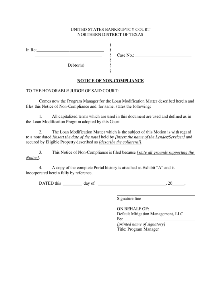 UNITED STATES BANKRUPTCY COURT NORTHERN DISTRICT OF Texas Re:___ ___ Debtor’s) Case No.: ___NOTICE OF NONCOMPLIANCE TO THE HONORABLE JUDGE OF SAID COURT: Comes now the Program Manager for the Loan