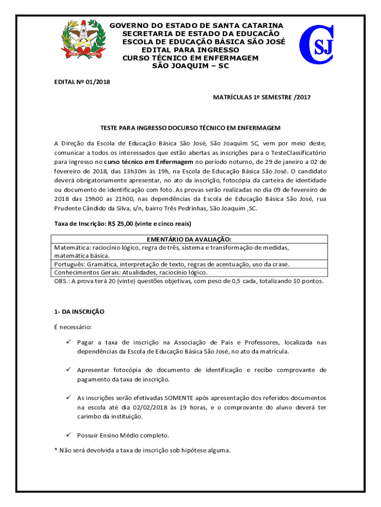 GOVERNOR DO ESTATE DE SANTA CATARINA SECRETARIAT DE ESTATE DA EDUC ACO ES COLA DE EDUC AO BS ICA SO JOB EDIT AL PARA INGRESS CURSE TCN ICO EM ENFERMAGEM SO JOAQUIM SC EDIT AL N 01/2018 MARCUS 1 SEMESTER