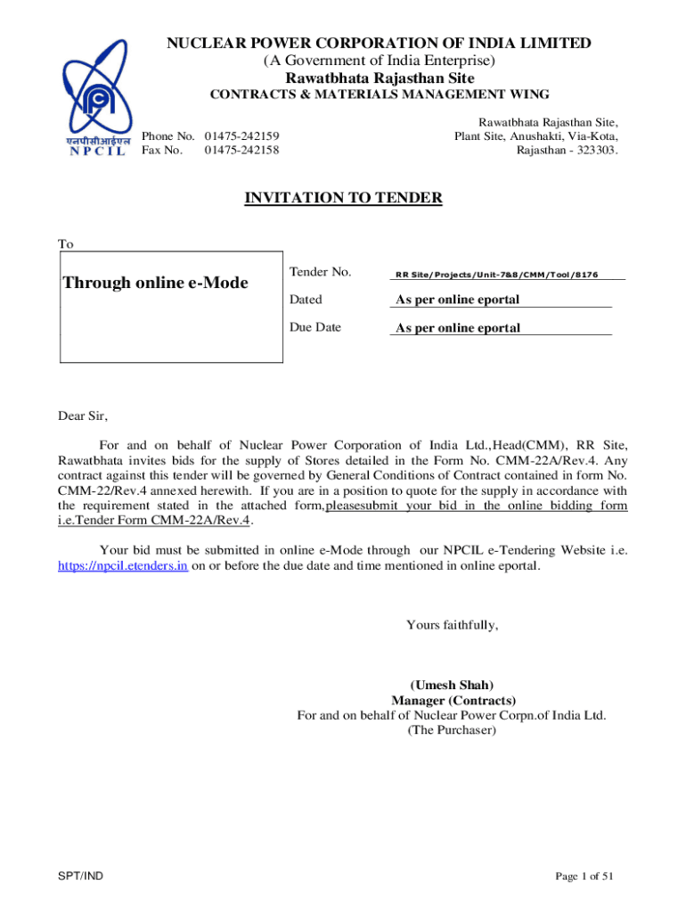 Get the free npcil.etenders.in tenderdoc NIT8176Through online e-Mode RR Site/Projects/Unit-7&...