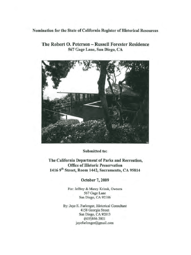 Nomination for the State of California Register of Historical Resources Robert 0. Peterson Russell Forester Residence 567 Gage Lane, San Diego, Submitted to: The California Department of Parks and