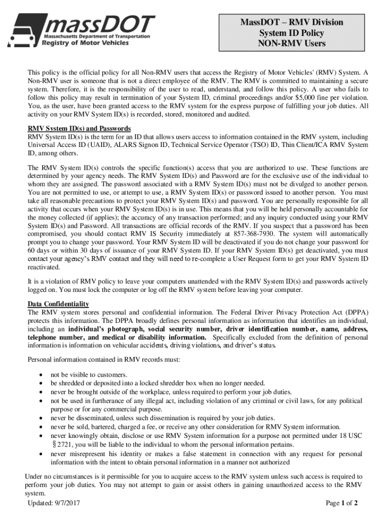 Mass DOT REV Division System ID Policy NORM Users This policy is the official policy for all Norm users that access the Registry of Motor Vehicles\' (REV) System. A Norm user is someone that is not