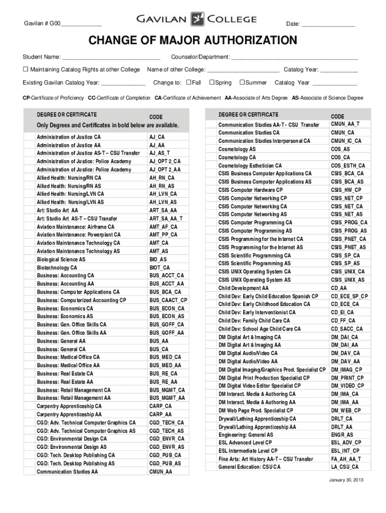 Get the free Online gavilan CHANGE OF MAJOR AUTHORIZATION ...