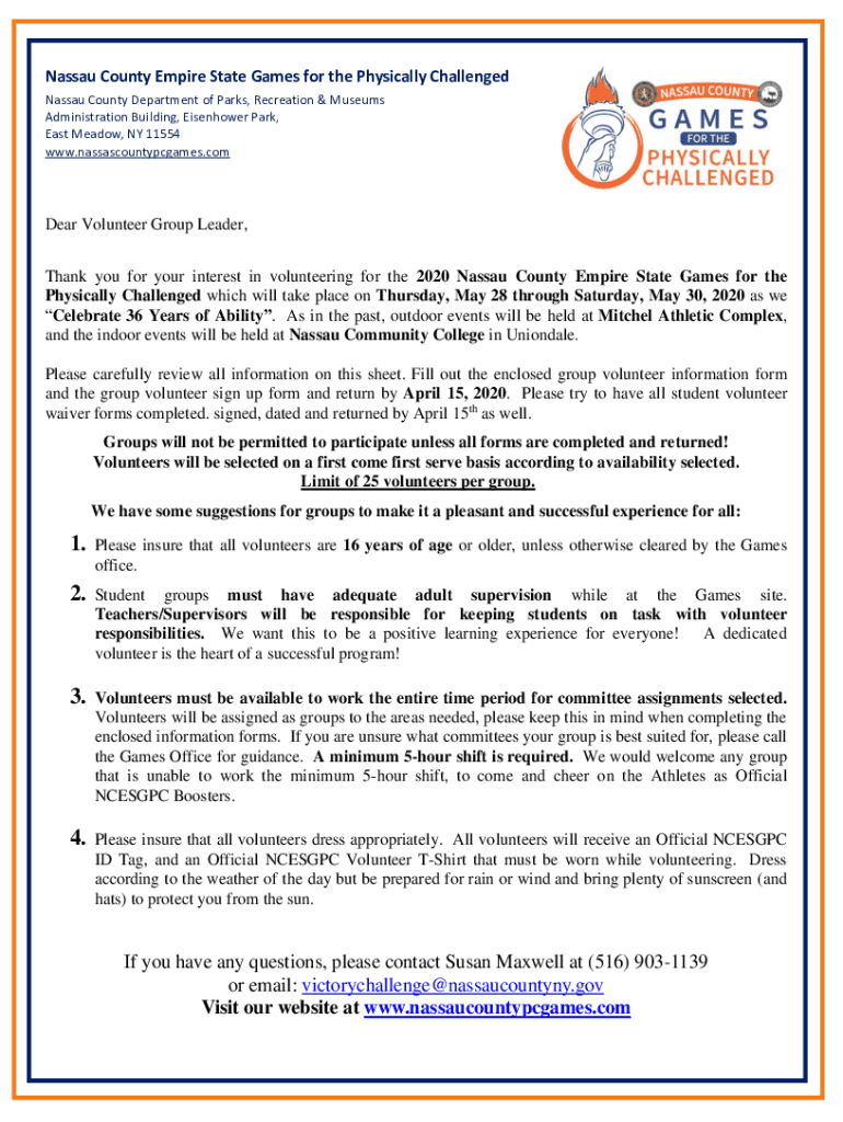 Nassau County Empire State Games for the Physically Challenged Nassau County Department of Parks, Recreation & Museums Administration Building, Eisenhower Park, East Meadow, NY 11554 www.nassascountypcgames.comDear