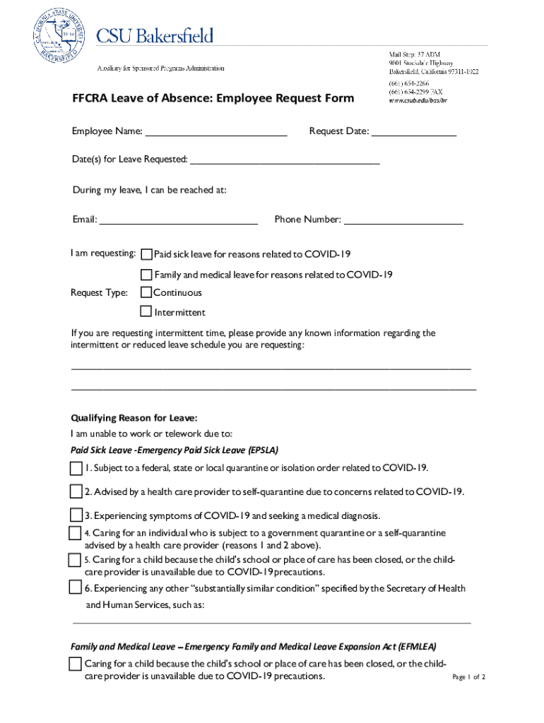 FFCRALeaveofAbsence:EmployeeRequestForm Employee Name: ___Request Date: ___Date’s) for Leave Requested: ___ During my leave, I can be reached at: Email: ___ I am requesting:Phone Number: ___Paid