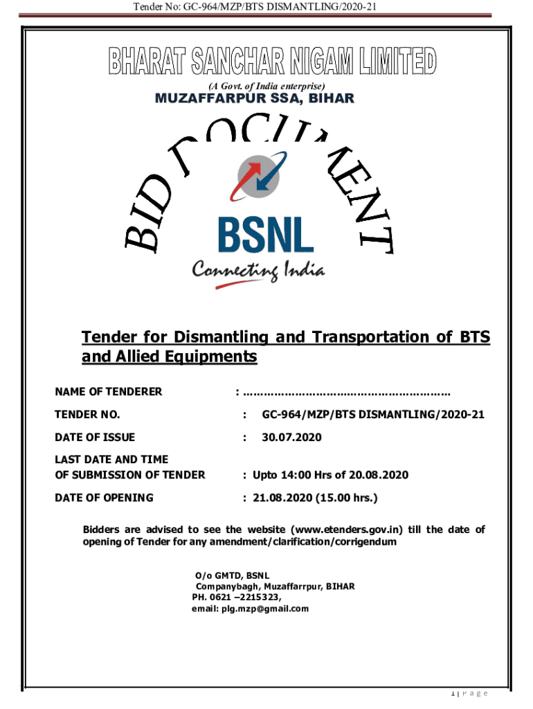 Tender No: GC964×MAP×BTS DISMANTLING×202021×A Govt. of India enterprise×MUZAFFARGARH SSA, Bartender for Dismantling and Transportation of BTS and Allied Equipments NAME OF TENDERER: TENDER NO.:GC964×MAP×BTS