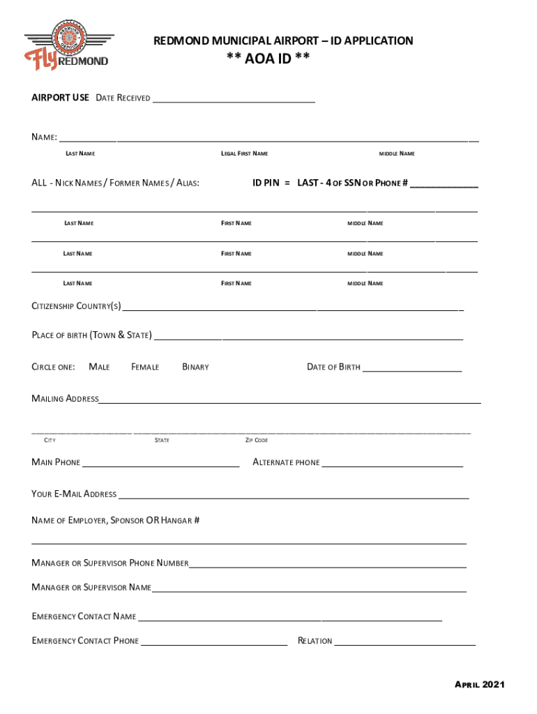 REDMOND MUNICIPAL AIRPORT ID APPLICATION** AOA ID ** AIRPORT USE DATE RECEIVED ___NAME: ___ LAST NAMELESS FIRST NAME ALL NICK NAMES / FORMER NAMES / ALIAS:MIDDLE NAMED PIN LAST 4 OF SSN OR PHONE #