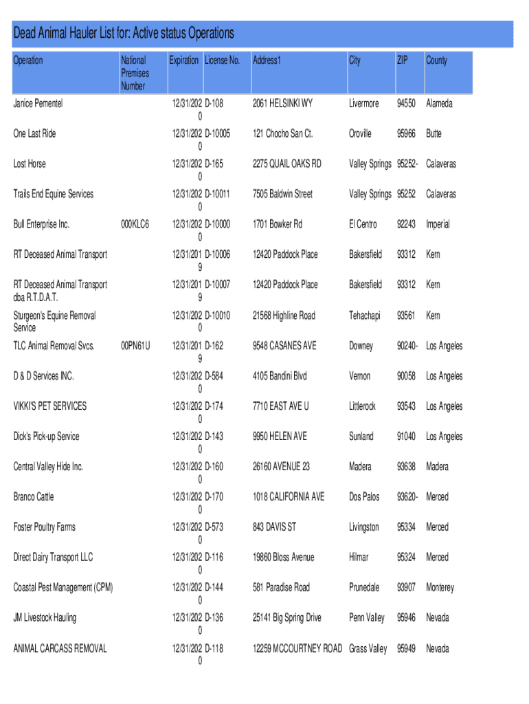 Dead Animal Hauler List for: Active status Operations OperationNational Premises NumberExpiration License No. Address1CityZIPCountyJanice Pementel12×31×202 D108 02061 HELSINKI WYLivermore94550AlamedaOne