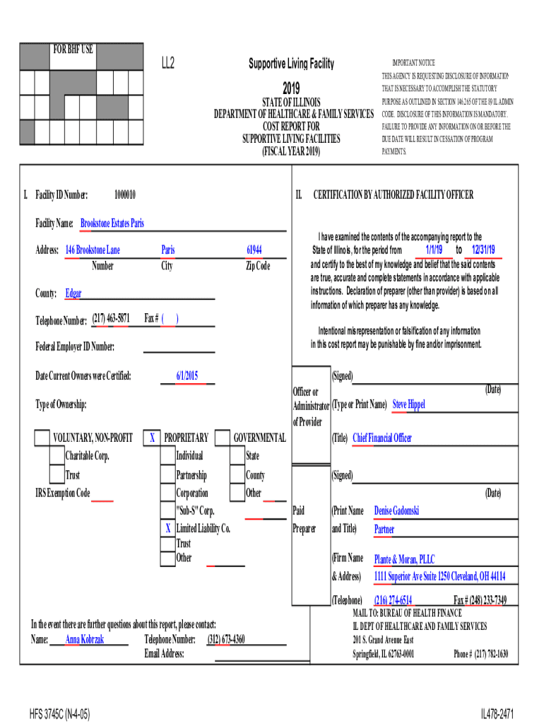 FOR BHF USELL2Supportive Living Facility2019STATE OF ILLINOIS DEPARTMENT OF HEALTHCARE & FAMILY SERVICES COST REPORT FOR SUPPORTIVE LIVING FACILITIES (FISCAL YEAR 2019× I. Facility ID Number: Facility