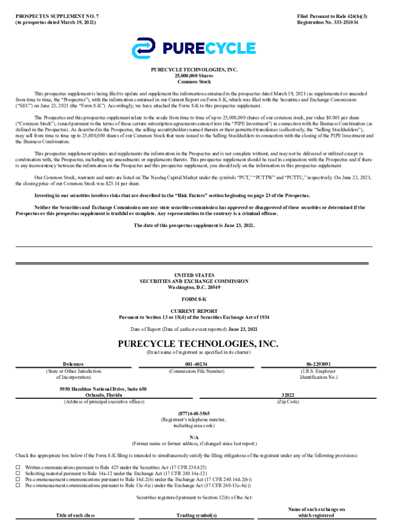 PROSPECTUS SUPPLEMENT NO. 7 (to prospectus dated March 19, 2021×Filed Pursuant to Rule 424×b)(3) Registration No. 333251034PURECYCLE TECHNOLOGIES, INC. 25,000,000 Shares Common Stock This prospectus
