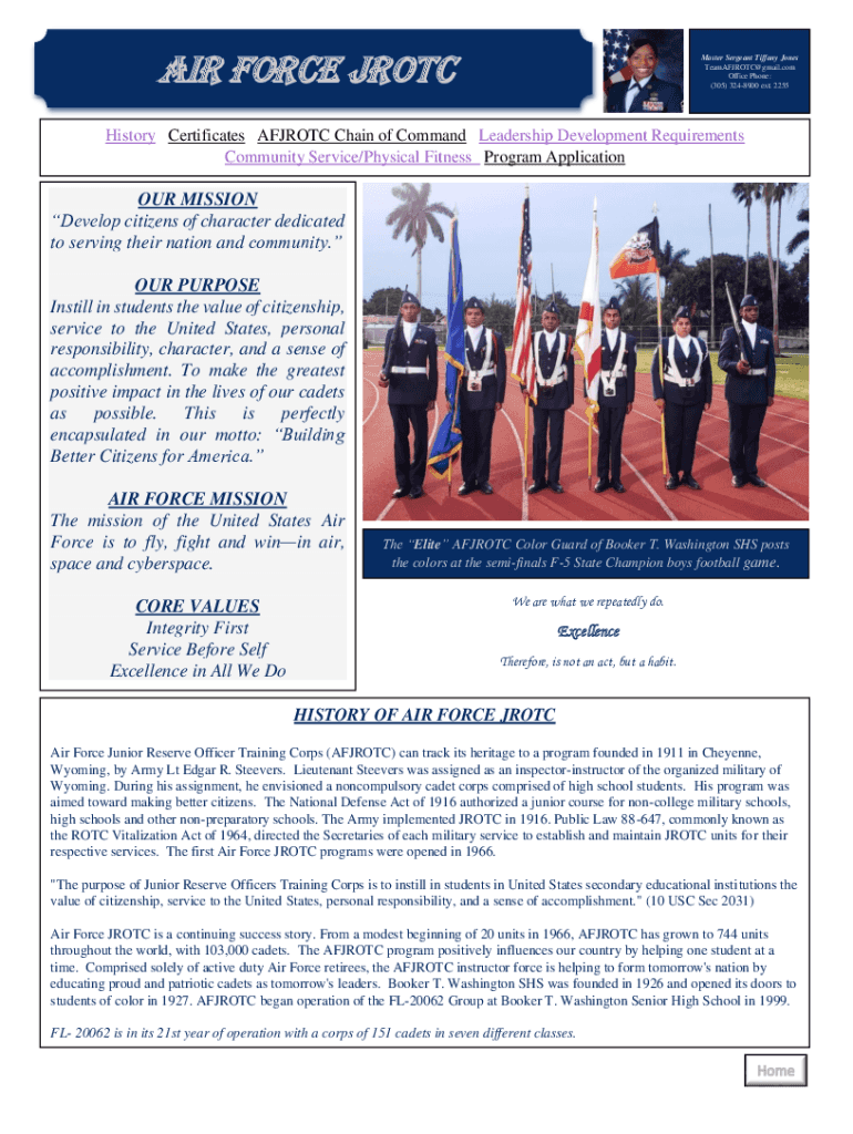 Air Force JROTCMaster Sergeant Tiffany Jones TeamAFJROTC×gmail.com Office Phone: (305× 3248900 ext. 2255History Certificates AFJ ROTC Chain of Command Leadership Development Requirements Community