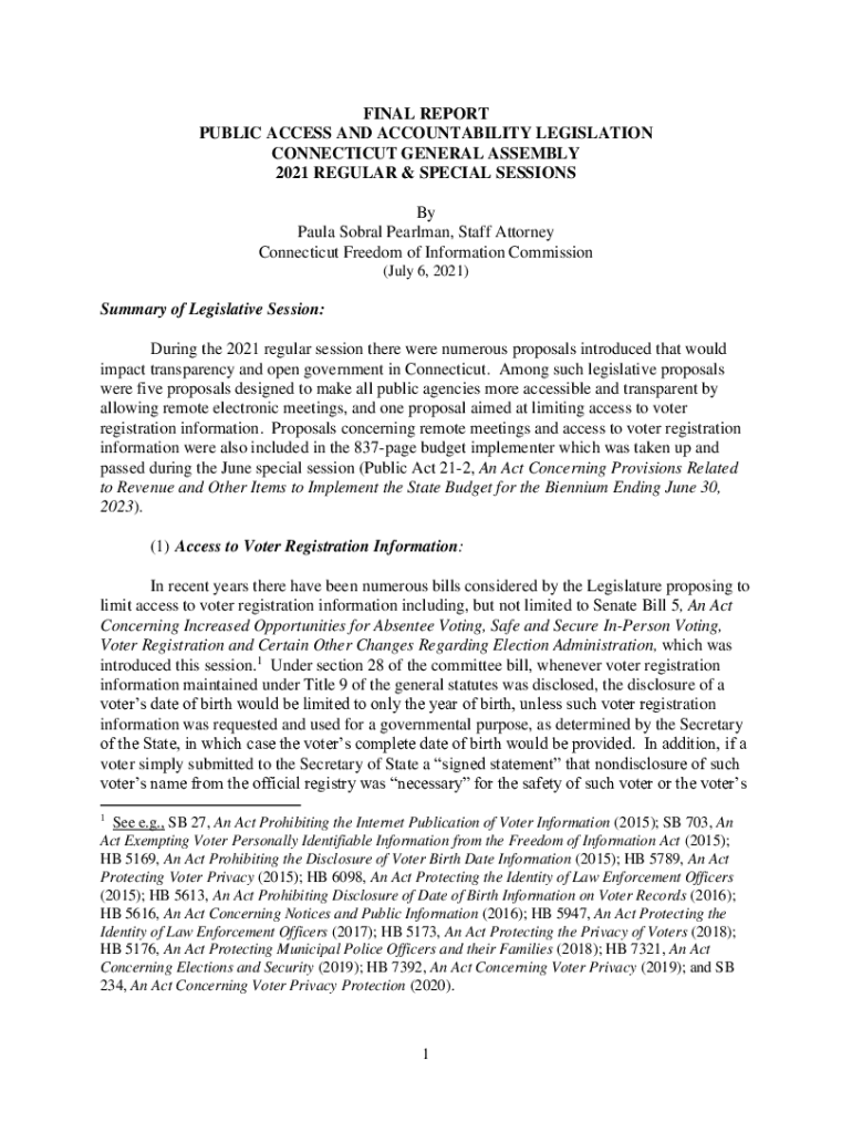 FINAL REPORT PUBLIC ACCESS AND ACCOUNTABILITY LEGISLATION CONNECTICUT GENERAL ASSEMBLY 2021 REGULAR & SPECIAL SESSIONS By Paula Social Perelman, Staff Attorney Connecticut Freedom of Information Commission