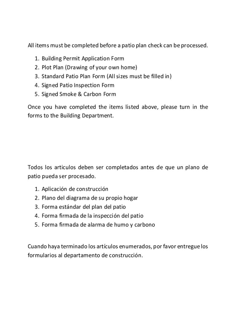 All items must be completed before a patio plan check can be processed. 1. 2. 3. 4. 5. Building Permit Application Form Plot Plan (Drawing of your own home) Standard Patio Plan Form (All sizes must