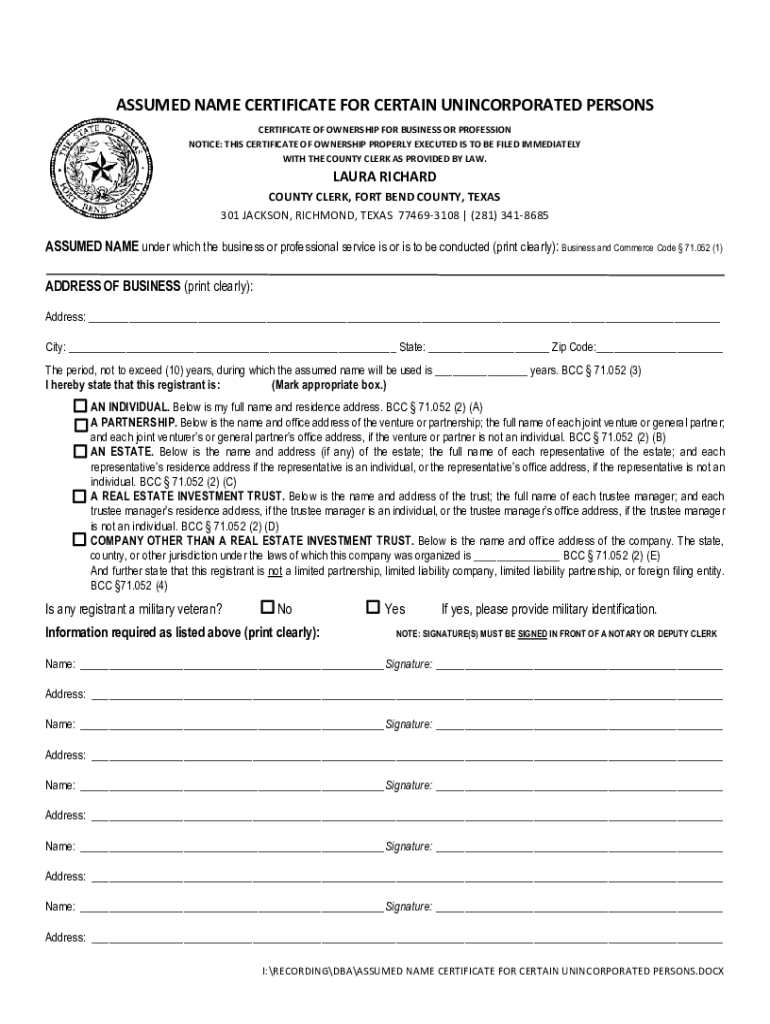 - Other business entities: Various other business structures, such as associations or cooperatives, may also need to register an assumed name certificate if they operate under a name different from the legal entity name.