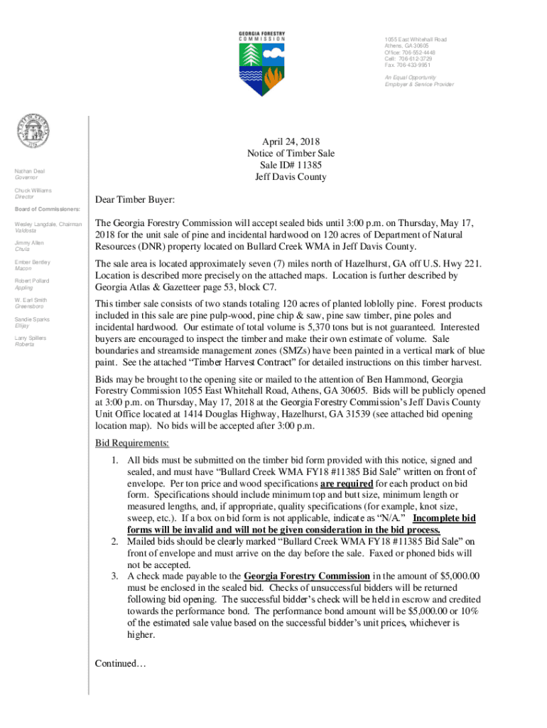 1055 East Whitehall Road Athens, GA 30605 Office: 7065524448 Cell: 7066123729 Fax. 7064339951 An Equal Opportunity Employer & Service Provider April 24, 2018, Notice of Timber Sale ID# 11385 Jeff