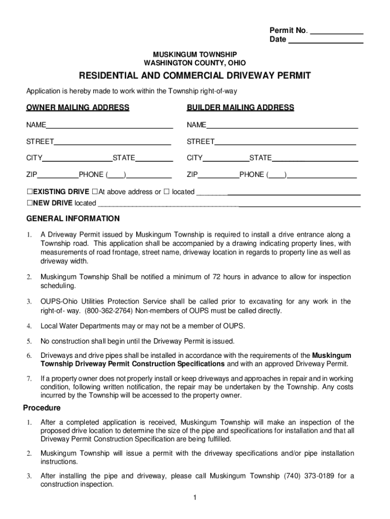 Permit No. Date MASKING TOWNSHIP WASHINGTON COUNTY, OHIORESIDENTIAL AND COMMERCIAL DRIVEWAY PERMIT Application is hereby made to work within the Township rightofwayOWNER MAILING ADDRESSBUILDER MAILING