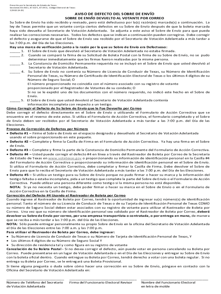 Prescribe POR la Secretary de Estado de Texas Sections 63.0011, 87.0271, 87.0411, Cargo Electoral de Texas 1×2022 ×823)AVIS ODE DEFECT DEL SORE DE ENDOSPORE DE ENVOY DEVELOP AL ROTATE POR CORR EO