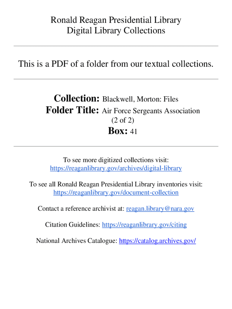 Ronald Reagan Presidential Library Digital Library CollectionsThis is a PDF of a folder from our textual collections. Collection: Blackwell, Morton: Files Folder Title: Air Force Sergeants Association
