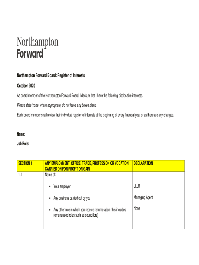 Northampton Forward Board: Register of Interests October 2020 As board member of the Northampton Forward Board, I declare that I have the following disclosable interests. Please state none where appropriate,
