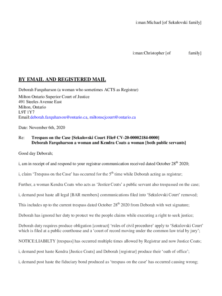 I:man:Michael [of Sekulovski family] 6403 Linear Drive Mississauga, Ontario L5N6X1 P: 4165799277 E: michaelsuniquecrown×gmail.com i:man:Christopher [of Pritchard family] 3190 Willow Lane Burlington,