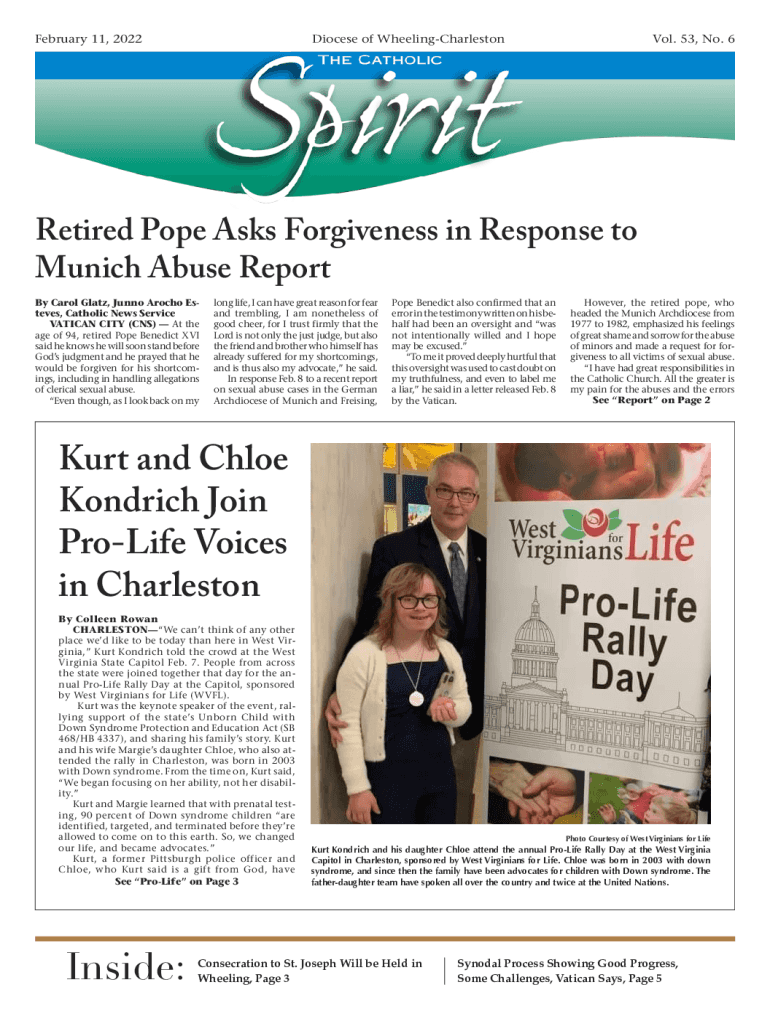 February 11, 2022Diocese of WheelingCharlestonVol. 53, No. 6Retired Pope Asks Forgiveness in Response to Munich Abuse Report By Carol Glitz, Juno Arch Est eves, Catholic News Service VATICAN CITY