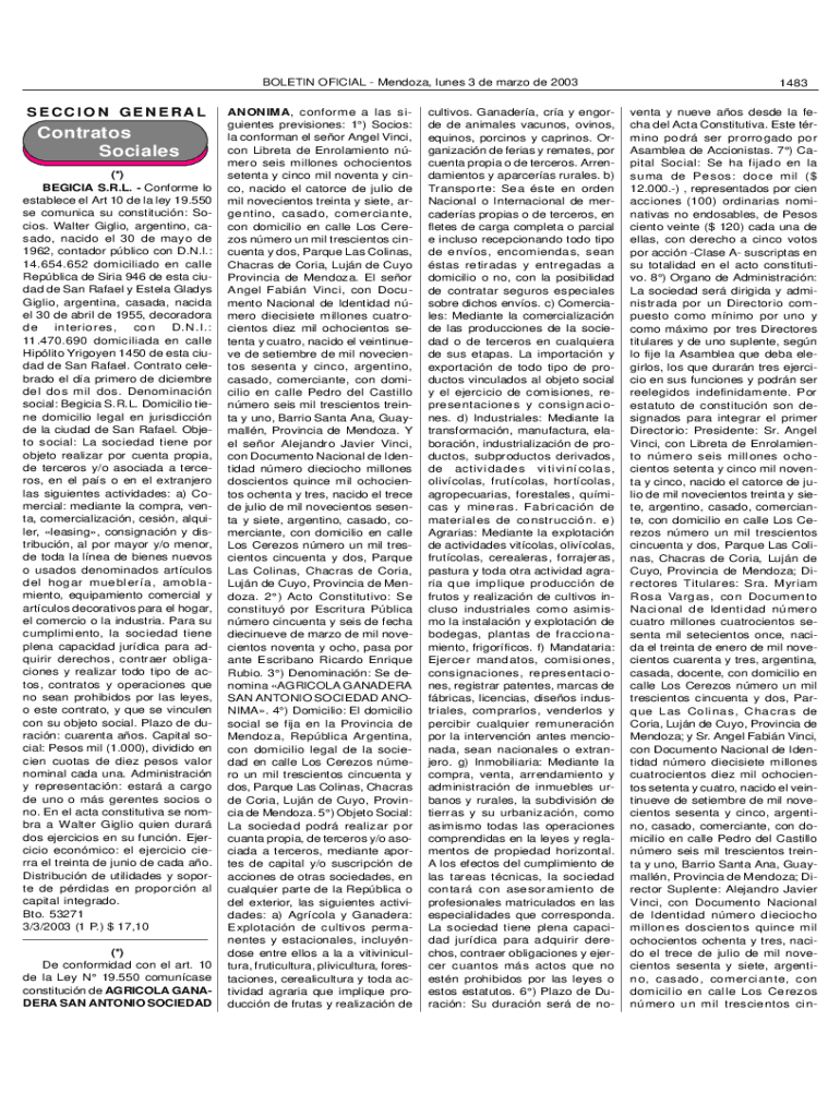 BOLTON OFFICIAL Mendoza, lines 3 de Mario de 2003SECCION GENERALContratos Socials (*) BENICIA S.R.L. Conform lo establish el Art 10 DE la La 19.550 SE Dominica SU constitution: Social. Walter Giulio,