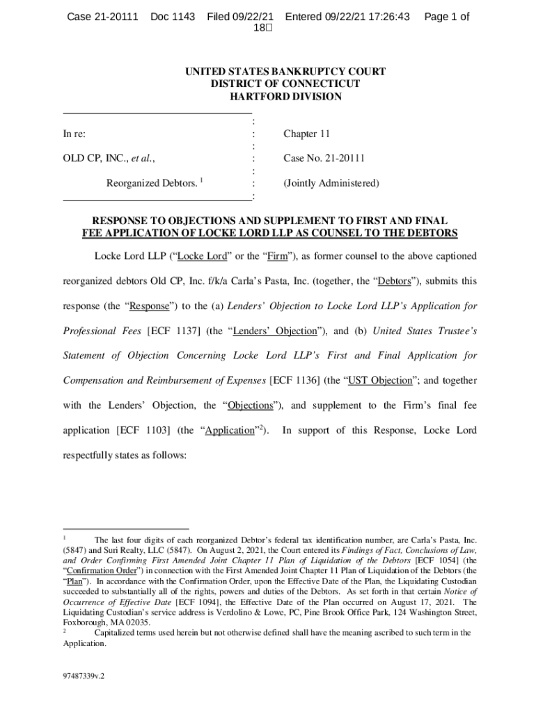 Case 2120111Doc 1143Filed 09×22/21 18Entered 09×22/21 17:26:43Page 1 United STATES BANKRUPTCY COURT DISTRICT OF CONNECTICUT HARTFORD DIVISION In re: OLD CP, INC., et al., Reorganized Debtors. 1: