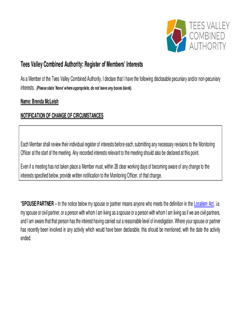 Tees Valley Combined Authority: Register of Members Interests As a Member of the Tees Valley Combined Authority, I declare that I have the following disclosable pecuniary and×or nonpecuniary interests.