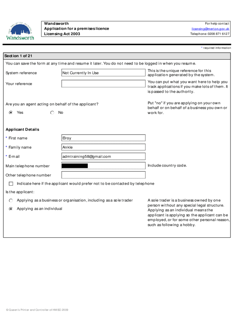 Wands worth Application for a premises license Licensing Act 2003For help contact licensing×Merton.gov.UK Telephone: 0208 871 6127* required informationSection 1 of 21 You can save the form at any