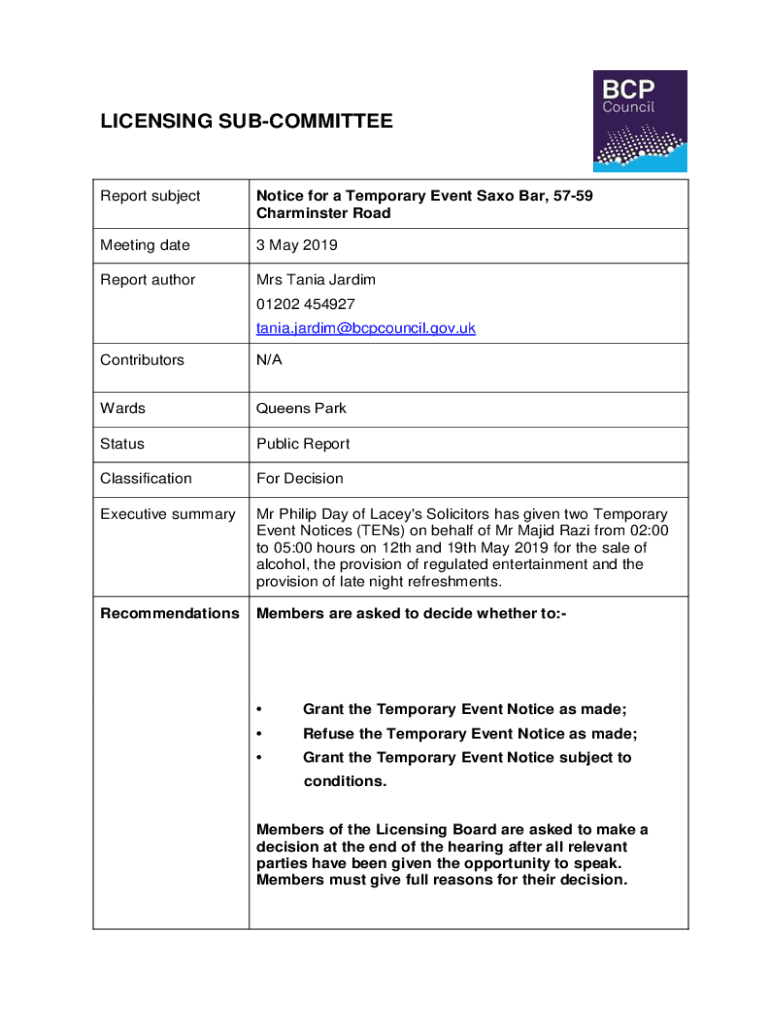 LICENSING SUBCOMMITTEEReport subjectNotice for a Temporary Event Saxon Bar, 5759 Char minster Readmitting date3 May 2019Report author Mrs Tania Jar dim 01202 454927 Tania.jar dim×council.gov.contributors×Awards