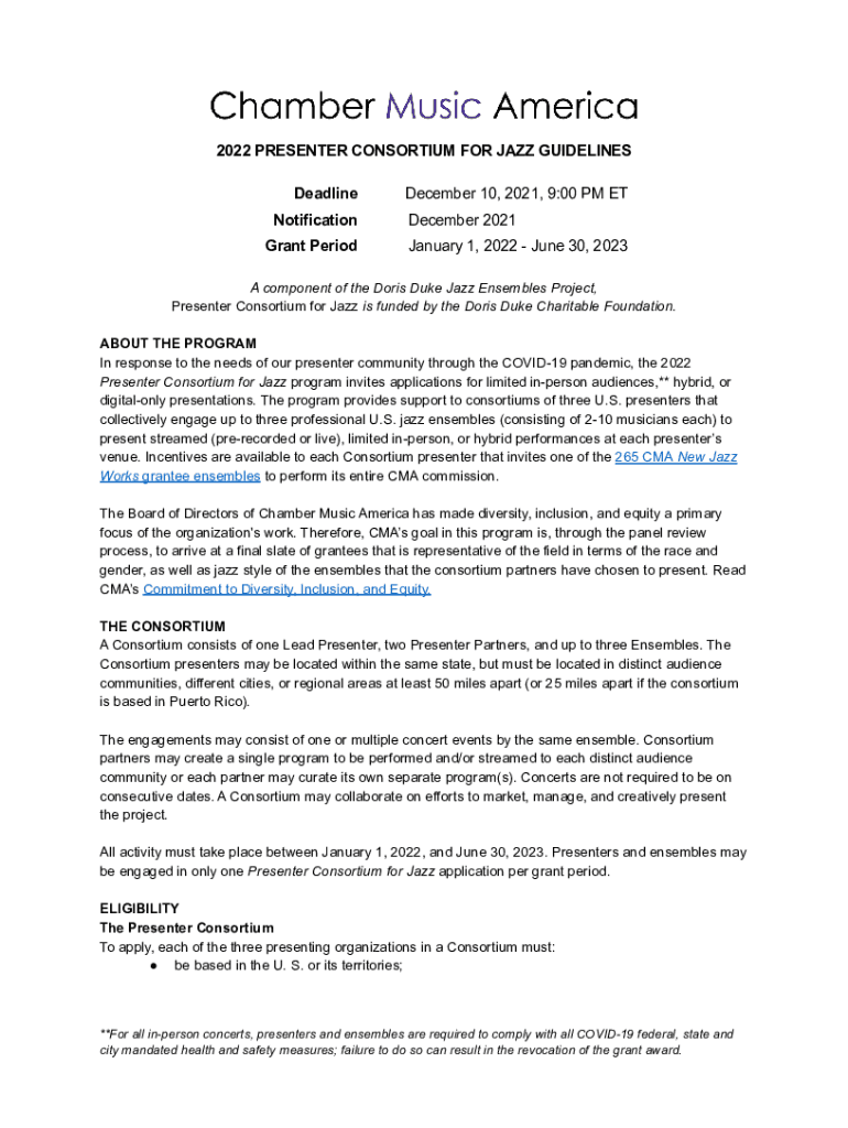 2022 PRESENTER CONSORTIUM FOR JAZZ GUIDELINES Deadline Notification Grant Period December 10, 2021, 9:00 PM ET December 2021 January 1, 2022, June 30, 2023A component of the Doris Duke Jazz Ensembles