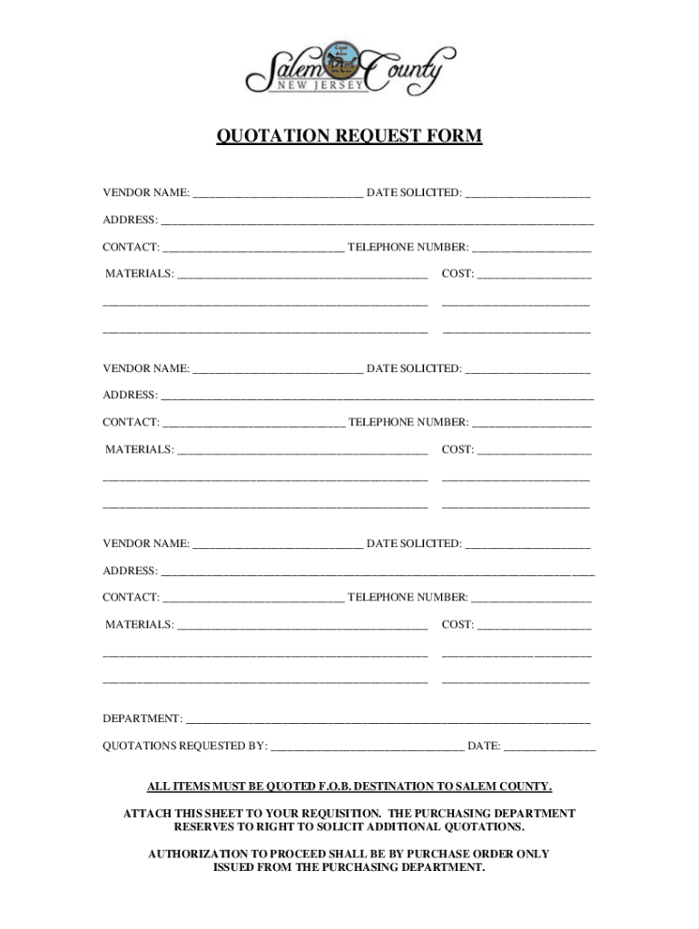 QUOTATION REQUEST FORM VENDOR NAME: ___ DATE SOLICITED: ___ ADDRESS: ___ CONTACT: ___ TELEPHONE NUMBER: ___ MATERIALS: ___COST: _______________VENDOR NAME: ___ DATE SOLICITED: ___ ADDRESS: ___ CONTACT: