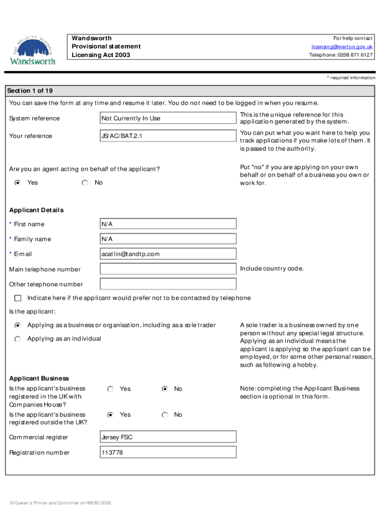 Wands worth Provisional statement Licensing Act 2003For help contact licensing×Merton.gov.UK Telephone: 0208 871 6127* required informationSection 1 of 19 You can save the form at any time and resume