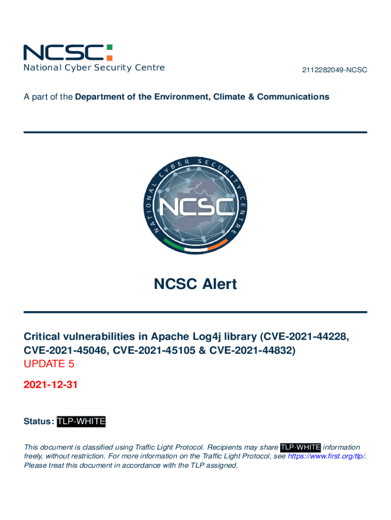 National Cyber Security Centre2112282049NCSCA part of the Department of the Environment, Climate & CommunicationsNCSC Overcritical vulnerabilities in Apache Log4j library (CVE202144228, CVE202145046,