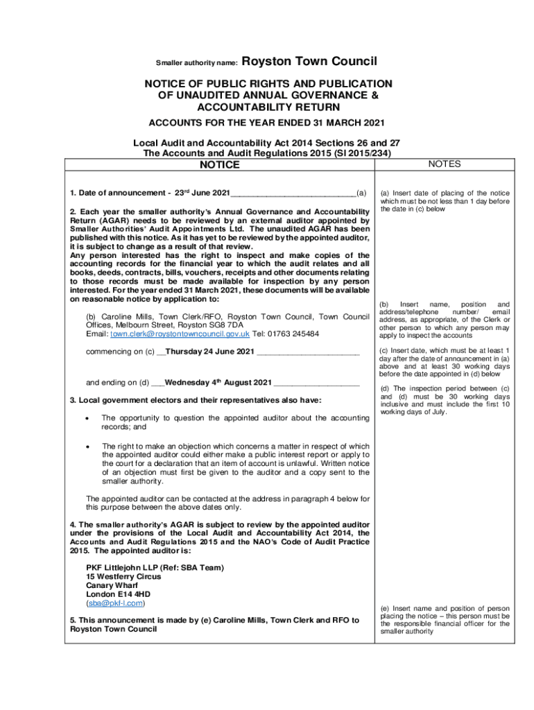 Smaller authority name:Boston Town CouncilNOTICE OF PUBLIC RIGHTS AND PUBLICATION OF UNAUDITED ANNUAL GOVERNANCE & ACCOUNTABILITY RETURN ACCOUNTS FOR THE YEAR ENDED 31 MARCH 2021 Local Audit and Accountability
