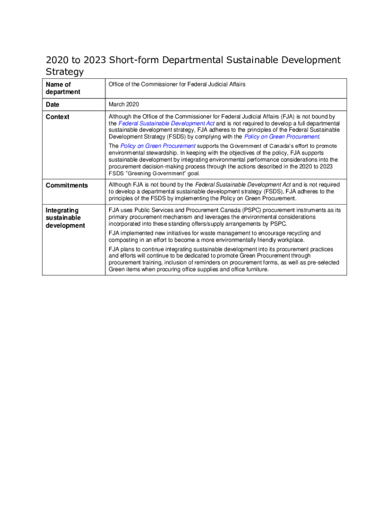 2020 to 2023 Short form Departmental Sustainable Development Strategy Name of departmentOffice of the Commissioner for Federal Judicial AffairsDateMarch 2020ContextAlthough the Office of the Commissioner