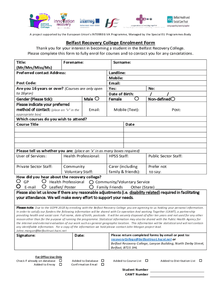A project supported by the European Unions INTERRED VA Program, Managed by the Special EU Programs Body Belfast Recovery College Enrollment Form Thank you for your interest in becoming a student in