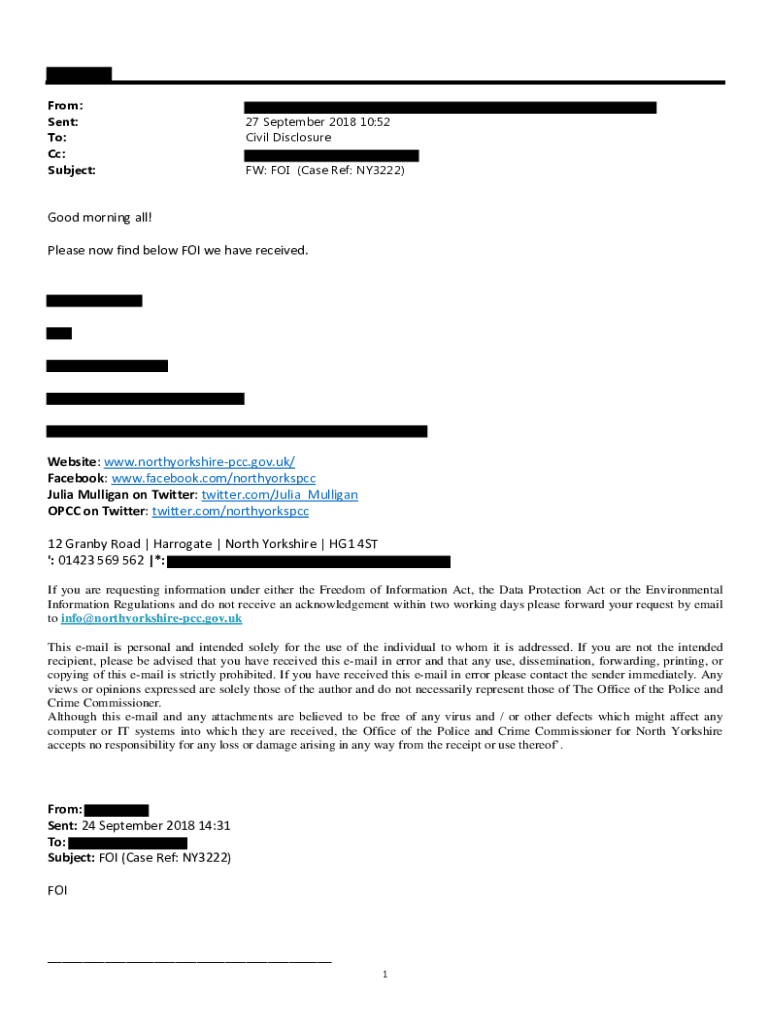 From: Sent: To: Cc: Subject:27 September 2018 10:52 Civil Disclosure FW: FOR (Case Ref: NY3222×Good morning all! Please now find below FOR we have received. Website: www.northyorkshirepcc.gov.uk/