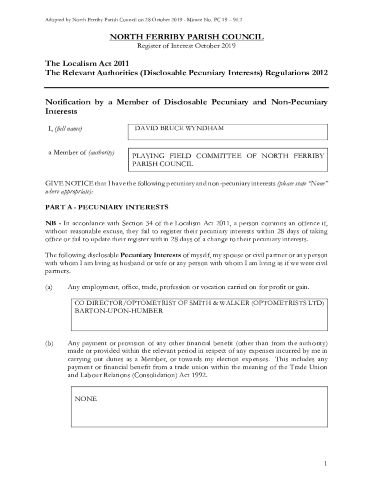 Adopted by North Ferry Parish Council on 28 October 2019 Minute No. PC 19 94.2NORTH FERRY PARISH COUNCIL Register of Interest October 2019The Loyalism Act 2011 The Relevant Authorities (Disclosable