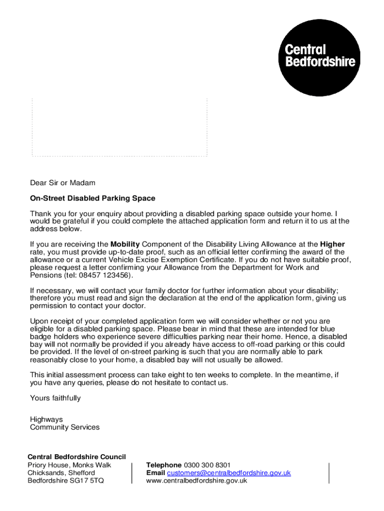 Dear Sir or Madam Street Disabled Parking Space Thank you for your inquiry about providing a disabled parking space outside your home. I would be grateful if you could complete the attached application