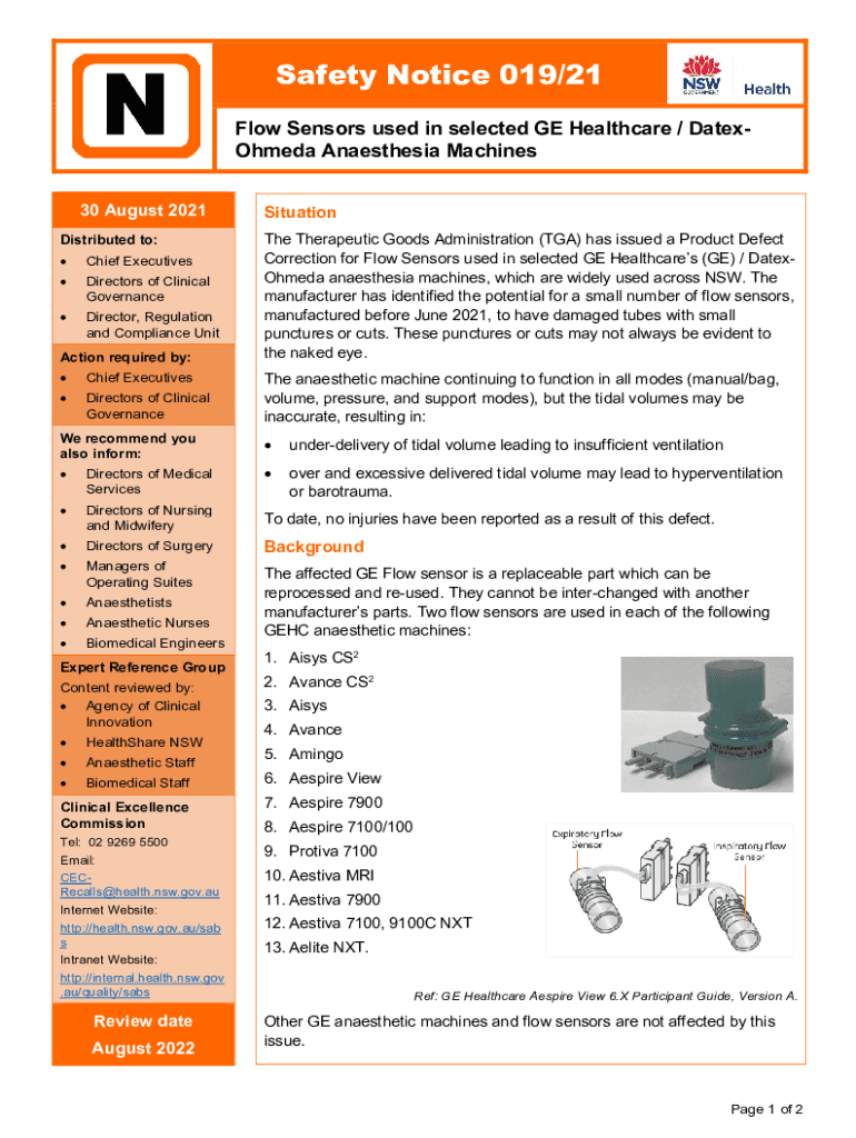 Safety Notice 019×21 Flow Sensors used in selected GE Healthcare / DatexOhmeda Anesthesia Machines 30 August 2021 Distributed to: Chief ExecutivesDirectors of Clinical GovernanceDirector, Regulation