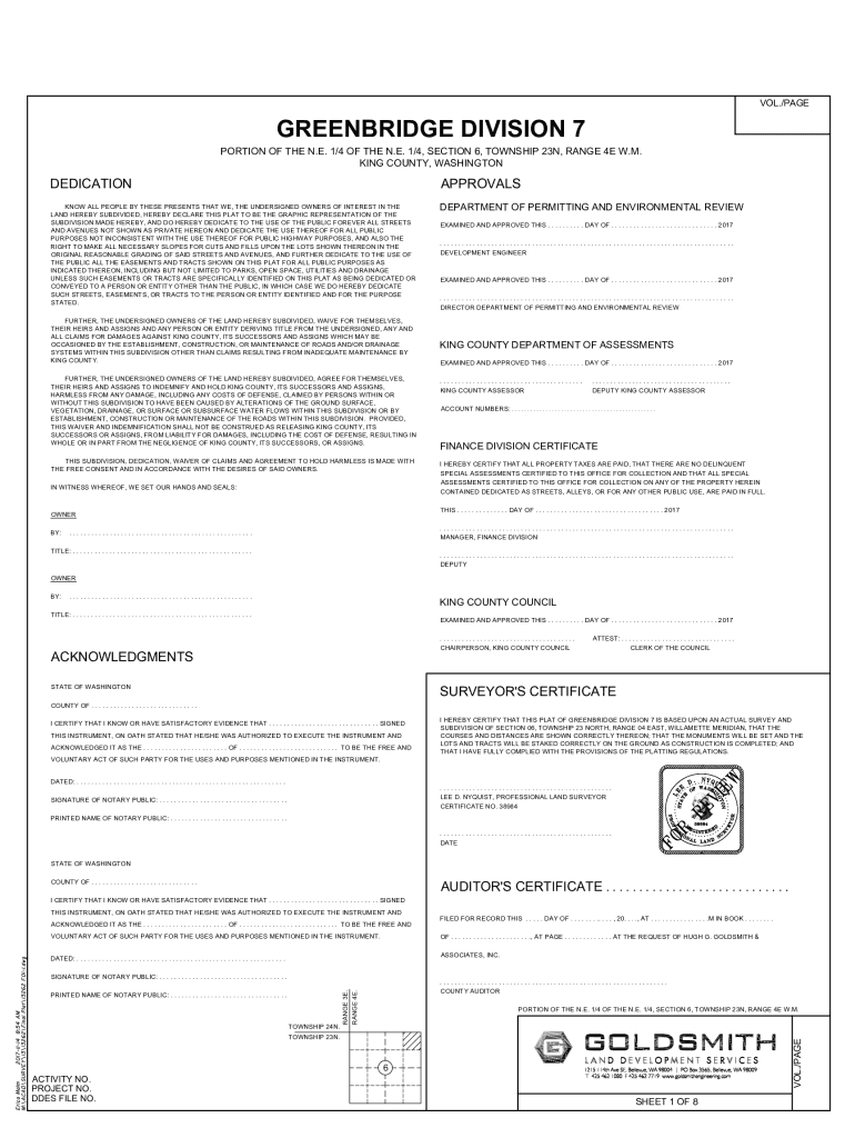 VOL.×PAGEGREENBRIDGE DIVISION 7 PORTION OF THE N.E. 1×4 OF THE N.E. 1×4, SECTION 6, TOWNSHIP 23 N, RANGE 4E W.M. KING COUNTY, WASHINGTONDEDICATIONAPPROVALSKNOW ALL PEOPLE BY THESE PRESENTS THAT
