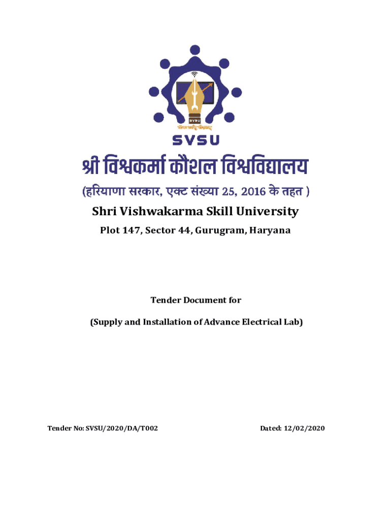 Sari Vishwakarma Skill University Plot 147, Sector 44, Guru gram, HaryanaTender Document for (Supply and Installation of Advance Electrical Lab×Tender No: GVSU×2020/DA×T002Dated: 12×02/20201.