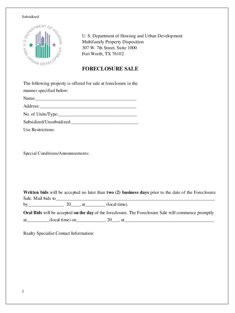 Subsidized. S. Department of Housing and Urban Development Multifamily Property Disposition 307 W. 7th Street, Suite 1000 Fort Worth, TX 76102FORECLOSURE SALE The following property is offered for