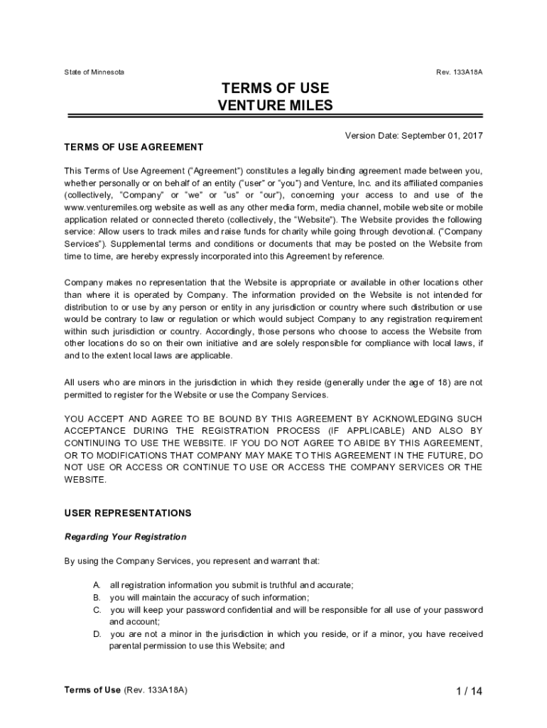 State of Minnesota Rev. 133A18ATERMS OF USE VENTURE MILES Version Date: September 01, 2017TERMS OF USE AGREEMENT This Terms of Use Agreement (Agreement) constitutes a legally binding agreement made