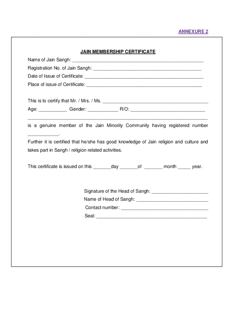 Get the free ANNEXURE 2 JAIN MEMBERSHIP CERTIFICATE