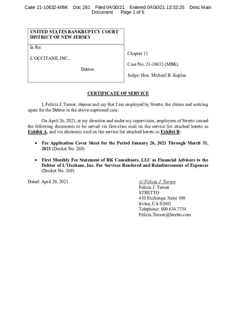 Case 2110632MBKDoc 281Filed 04×30/21 Entered 04×30/21 13:53:25 Document Page 1 of 6Desc Maintained STATES BANKRUPTCY COURT DISTRICT OF NEW JERSEY In Re: Chapter 11LOCCITANE, INC., Debtor. Case No.