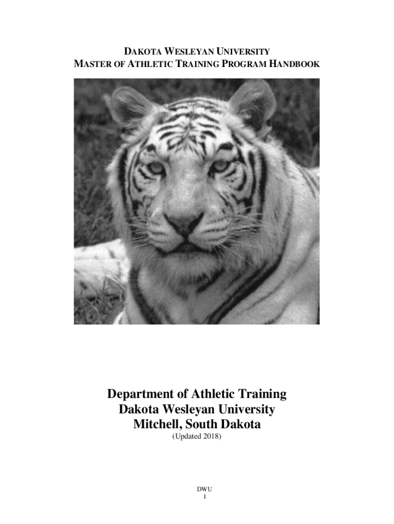 DAKOTA WESLEYAN UNIVERSITY MASTER OF ATHLETIC TRAINING PROGRAM HANDBOOKDepartment of Athletic Training Dakota Wesleyan University Mitchell, South Dakota (Updated 2018×DWM 1Table of Contents ContentsPAGEIntroduction3Program