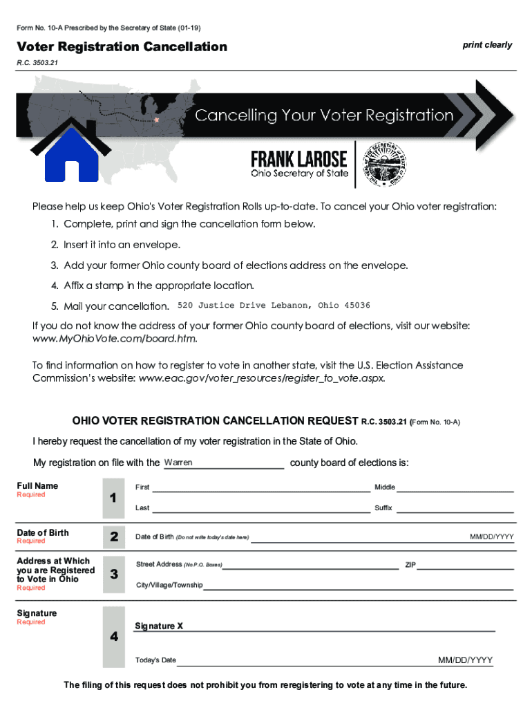 Form No. 10A Prescribed by the Secretary of State (0119×print clearlyVoter Registration Cancellation R.C. 3503.21Please help us keep Ohio\'s Voter Registration Rolls update. To cancel your Ohio voter