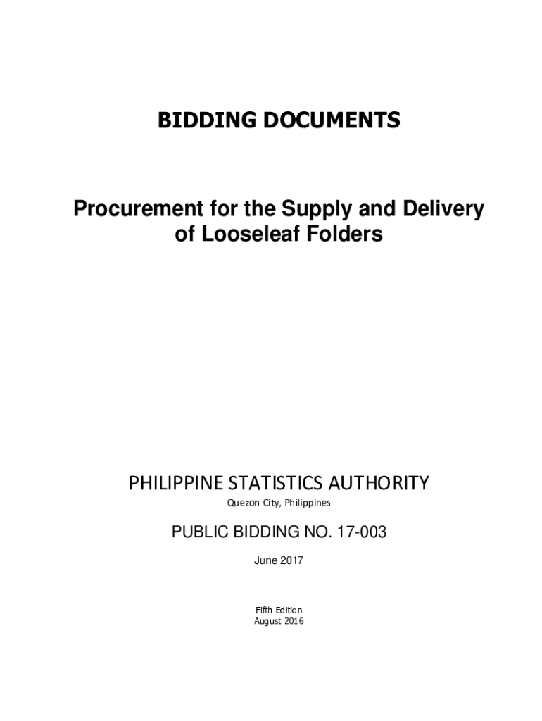 BIDDING DOCUMENTSProcurement for the Supply and Delivery of Loose leaf FoldersPHILIPPINE STATISTICS AUTHORITY Quezon City, PhilippinesPUBLIC BIDDING NO. 17003 June 2017Fifth Edition August 2016Procurement