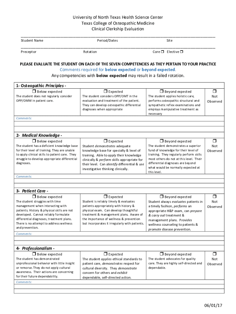 University of North Texas Health Science Center Texas College of Osteopathic Medicine Clinical Clerkship Evaluation___ Student NamePeriod×Despite___ PreceptorRotationCore Elective PLEASE EVALUATE